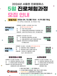 □ ‘학습지원’을 넘어 올해부터 ‘진로 지원’과 ‘취업 역량’까지 아우르는 종합 성장 플랫폼으로 도약한 <서울런 3.0>이 본격적인 진로 체험 프로그램 운영에 들어간다. 진로 체험을 제공할 ‘서울런 진로캠퍼스’는 5월에는 4개 기관에서 진행되고, 인공지능(AI)·미디어 콘텐츠 등 미래 유망 분야로 폭넓게 확장된다. 서울시는 올해 진로캠퍼스 50개 기관 연계를 목표로 하고 있다.